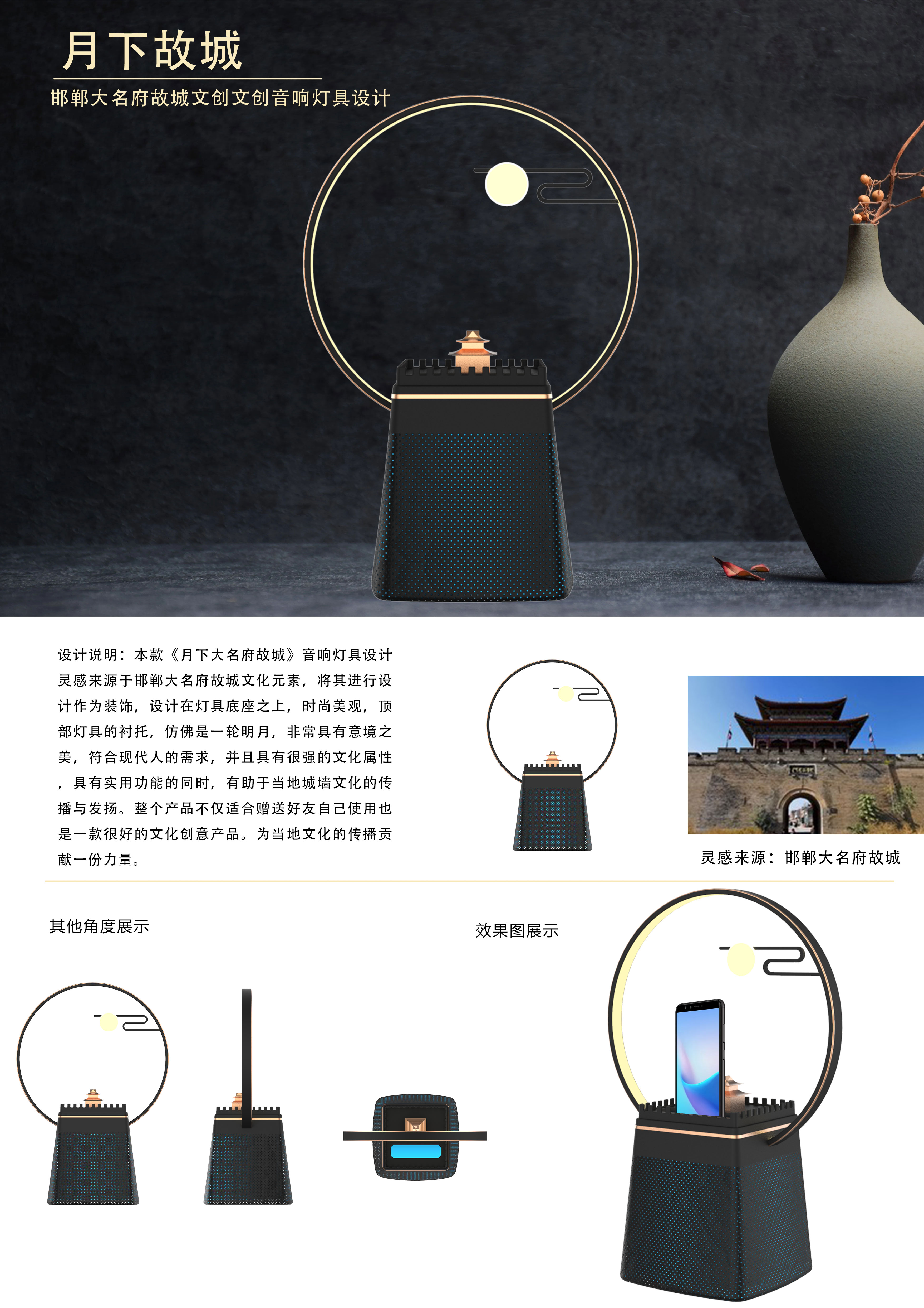 本款《月下大名府故城》音响灯具设计灵感来源于邯郸大名府故城文化元素,将其进行设计作为装饰,设计在灯具底座之上,时尚美观,顶部灯具的衬托,仿佛是一轮明月,非常具有意境之美,符合现代人的需求,并且具有很强的文化属性,具有实用功能的同时,有助于当地城墙文化的传播与发扬。整个产品不仅适合赠送好友自己使用也是一款很好的文化创意产品。为当地文化的传播贡献一份力量。
