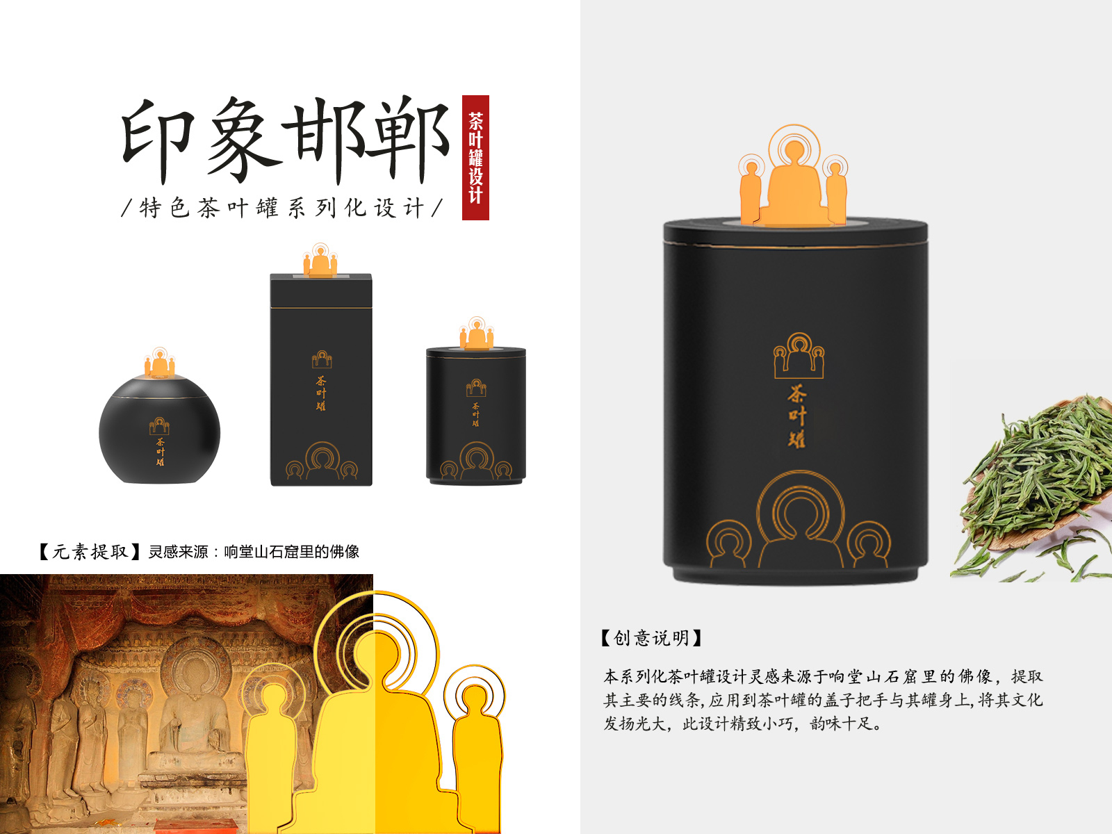 本系列设计灵感来源于响堂山石窟,提取其主要的线条,设计成书架、香器、茶叶罐,造型形象逼真,特色的工艺加工,充分体现出当地的特色文化。极具当地特色给人留下很强的记忆,具有很强的实用性有助于弘扬当地的特色文化。