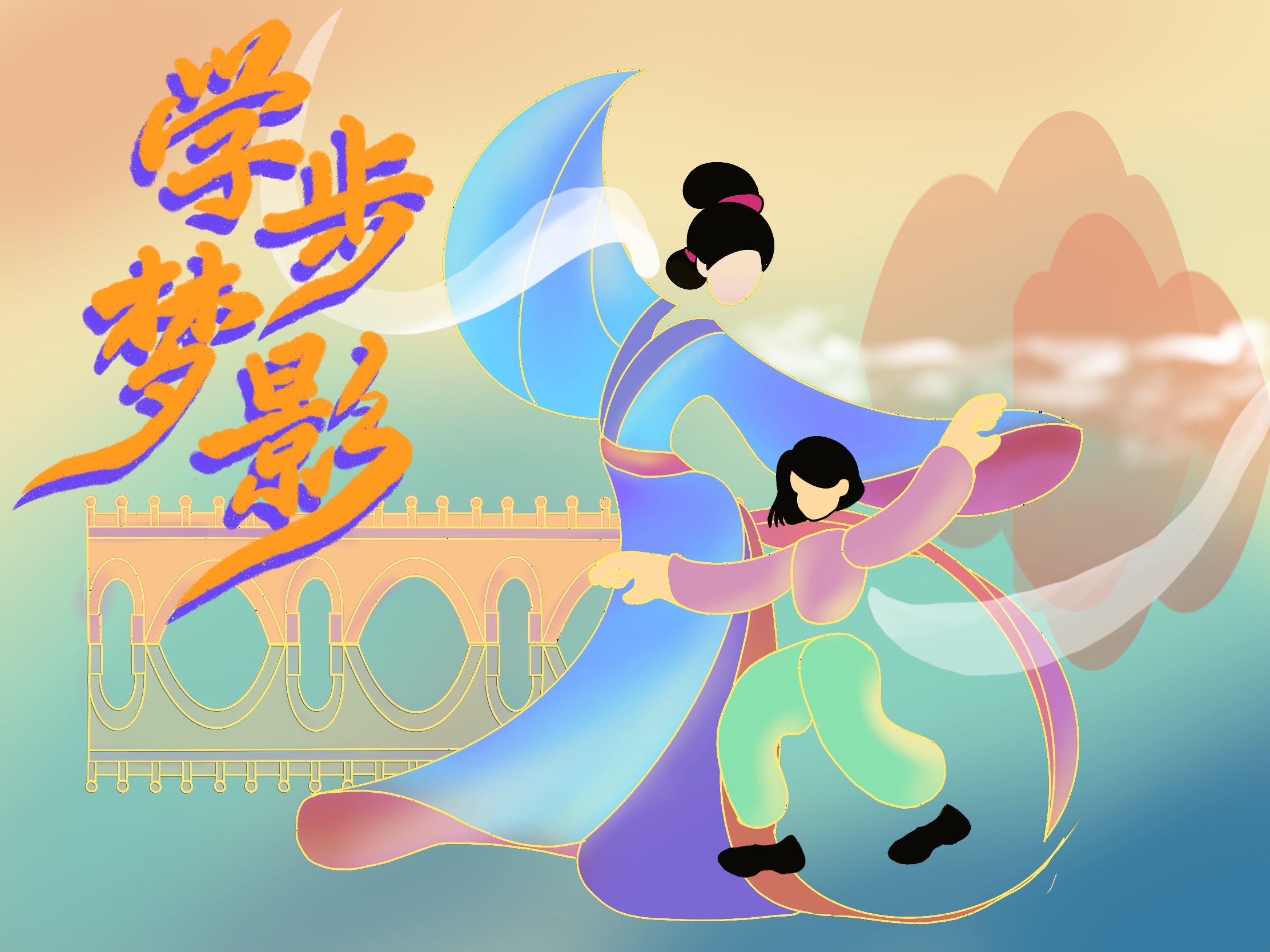 本作品以“邯郸学步”成语为创意蓝本,突破传统典故的批判视角,赋予其“对美好事物的追慕与传承”的全新内涵。画面核心构建古今对话场景:身着传统服饰的古代美女舞姿轻盈曼妙,尽显古典韵律之美;一旁的现代人神情专注,以模仿姿态传递对这份美好的向往与学习之心。背景选取邯郸标志性建筑“学步桥”,既点明典故发源地,又以古桥的沧桑质感烘托出跨越时空的文化联结。作品命名“学步梦影”,“学步”呼应核心行为,“梦影”则为画面增添朦胧诗意,暗喻美好事物如梦境般引人追寻,整体通过古今元素的碰撞与融合,传递出对经典之美、文化之韵的热爱与传承之意。