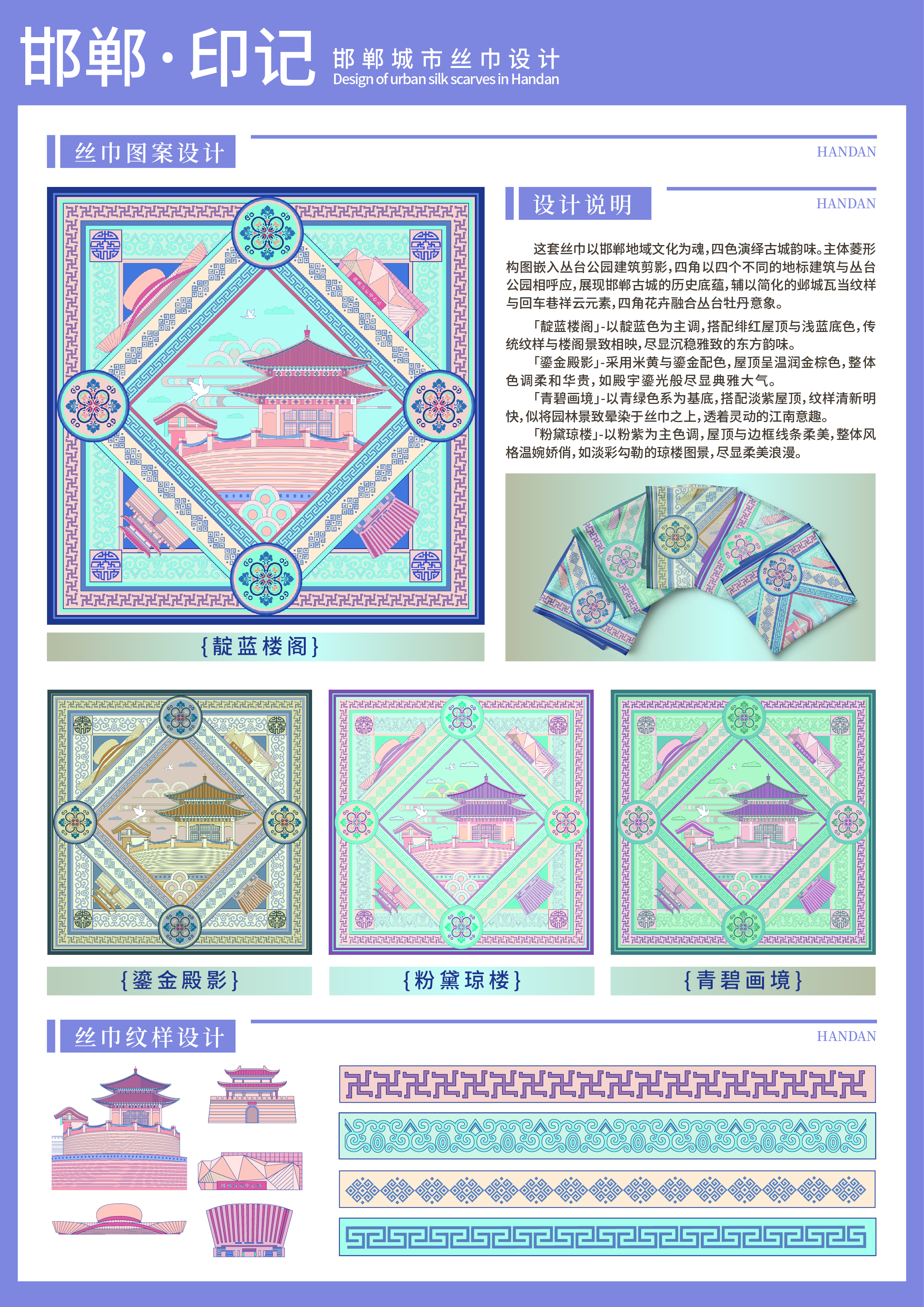 这套丝巾以邯郸地域文化为魂,四色演绎古城韵味。主体菱形构图嵌入丛台公园建筑剪影,四角以四个不同的地标建筑与丛台公园相呼应,展现邯郸古城的历史底蕴,辅以简化的邺城瓦当纹样与回车巷祥云元素,四角花卉融合丛台牡丹意象。