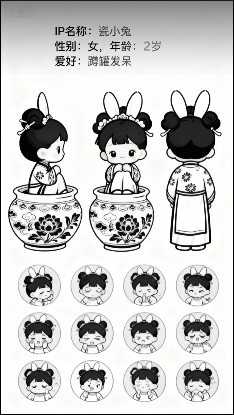 以邯郸地域文物为主题,采用磁州窑的纹样与牡丹花的纹路的结合打造了瓷小兔这个IP形象,实现文物的创意具象化,表情延展适配文旅传播,为邯郸地域文化传播与文旅产业赋能提供了创意具象化方案