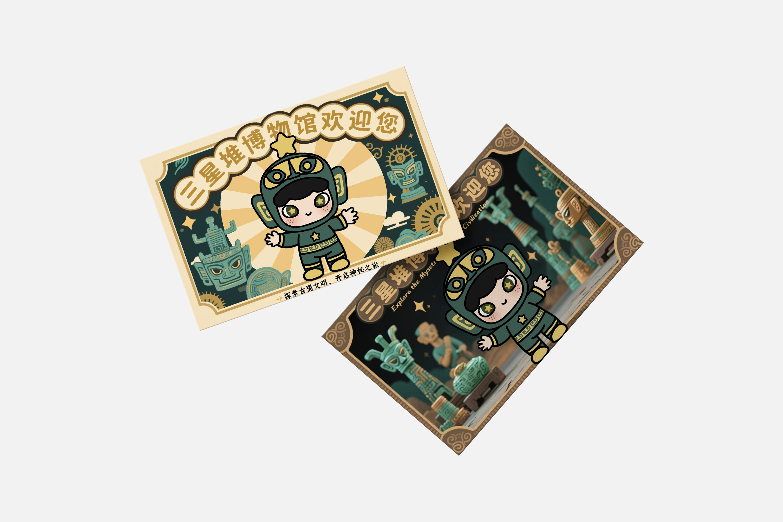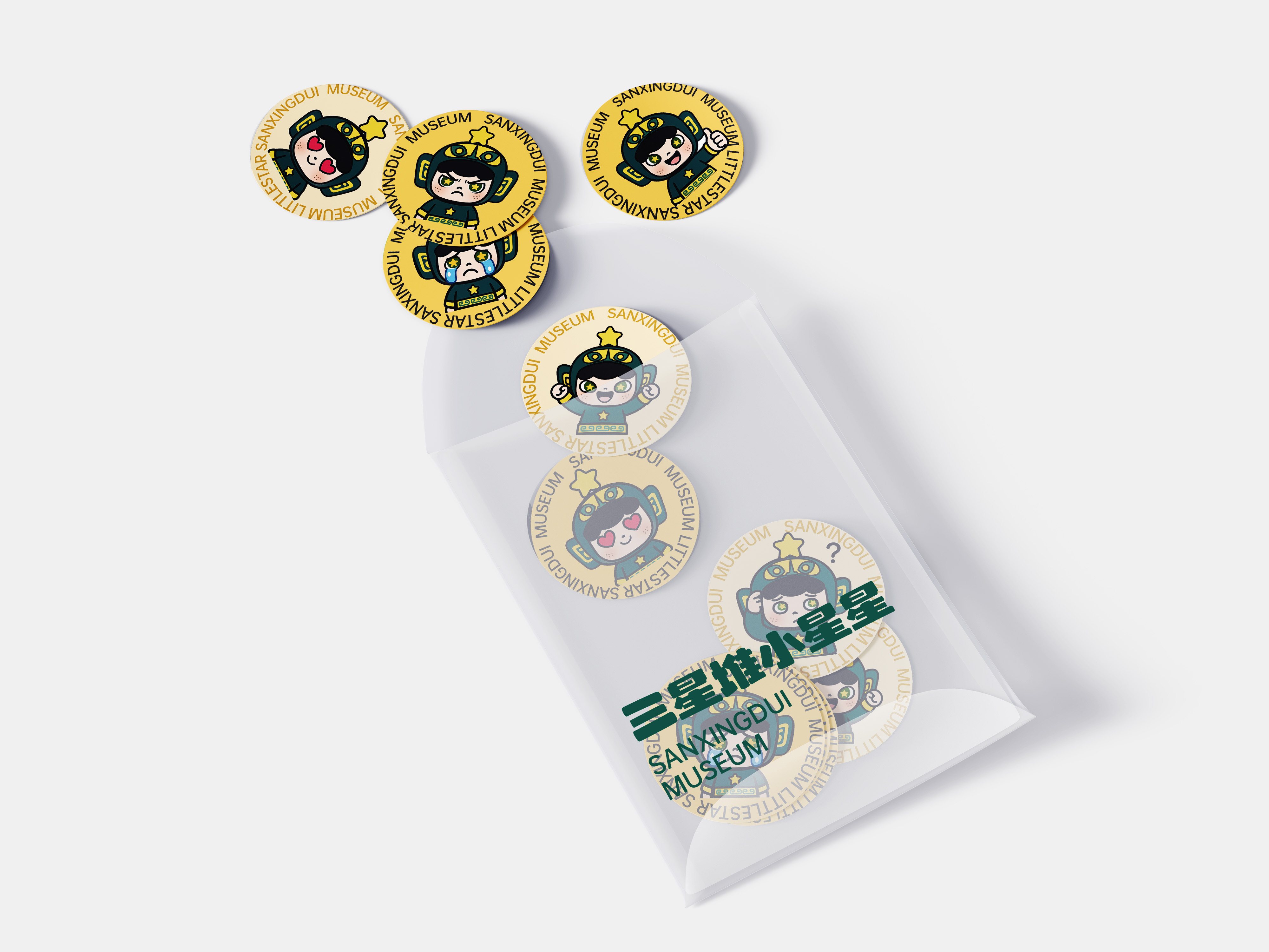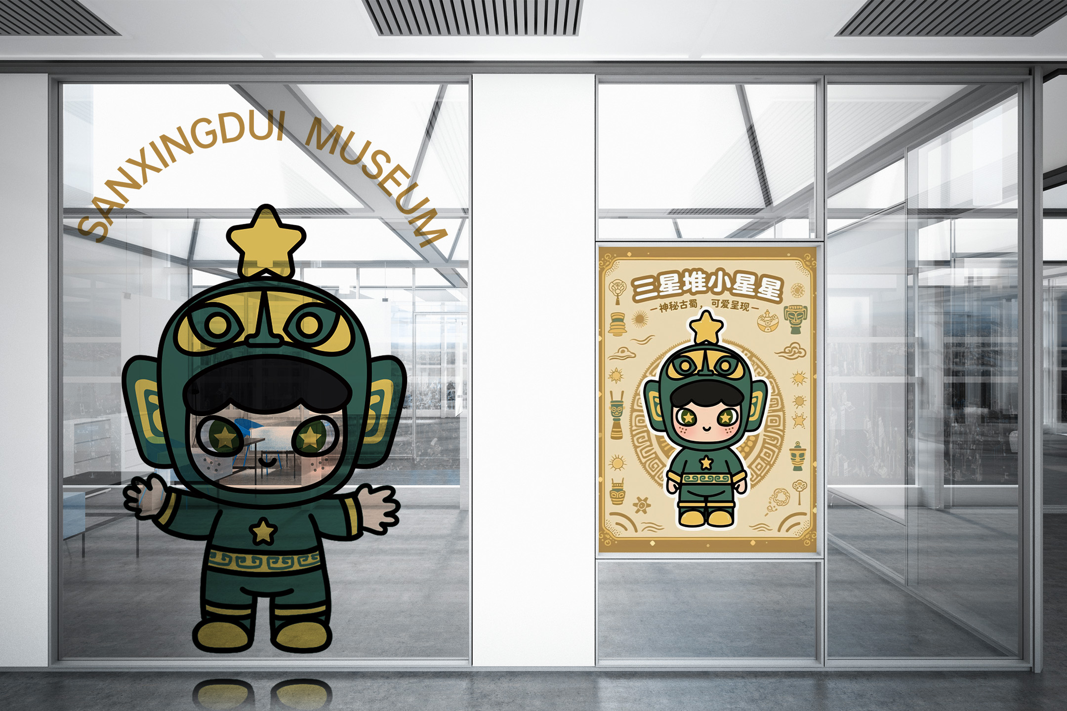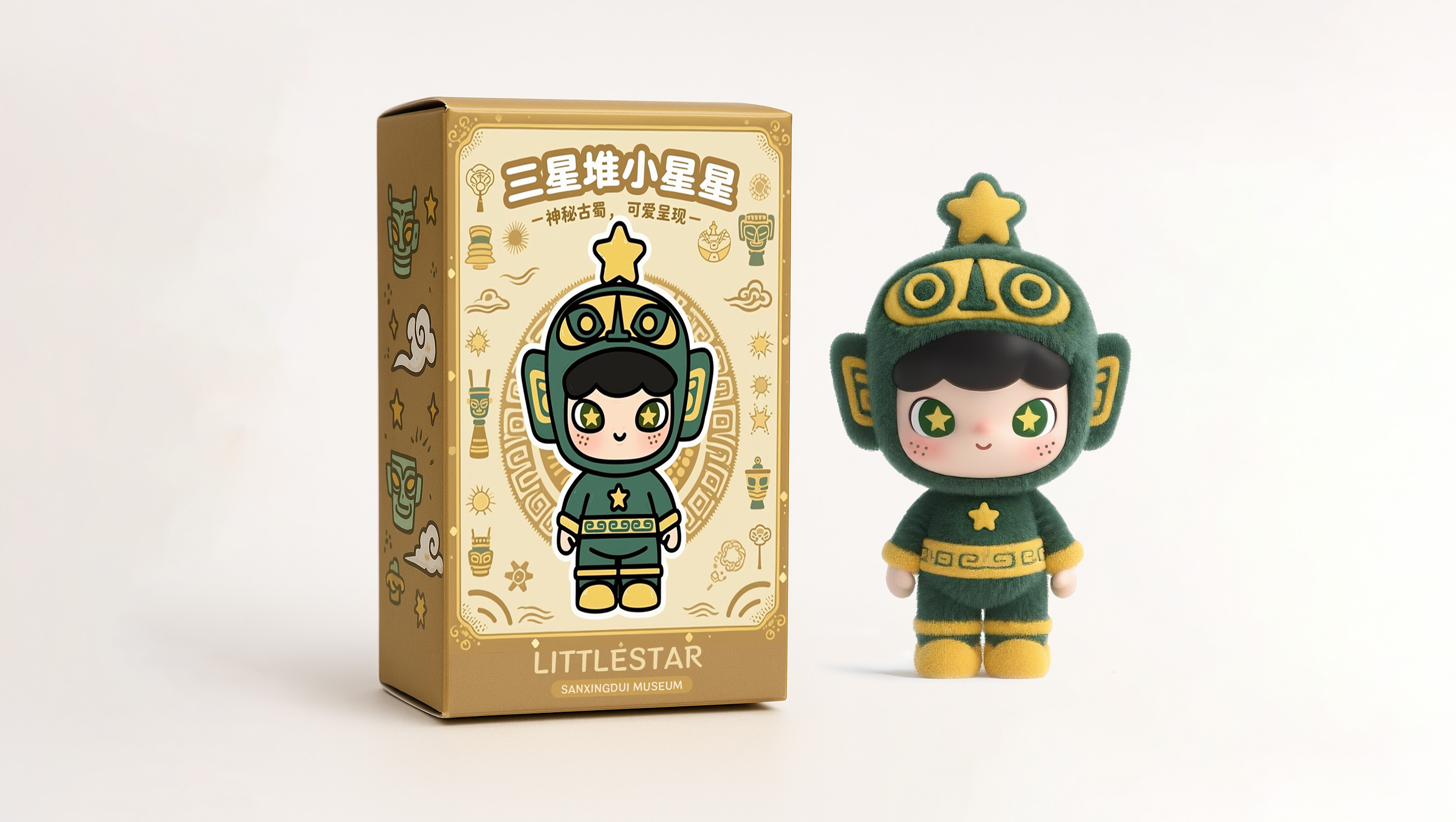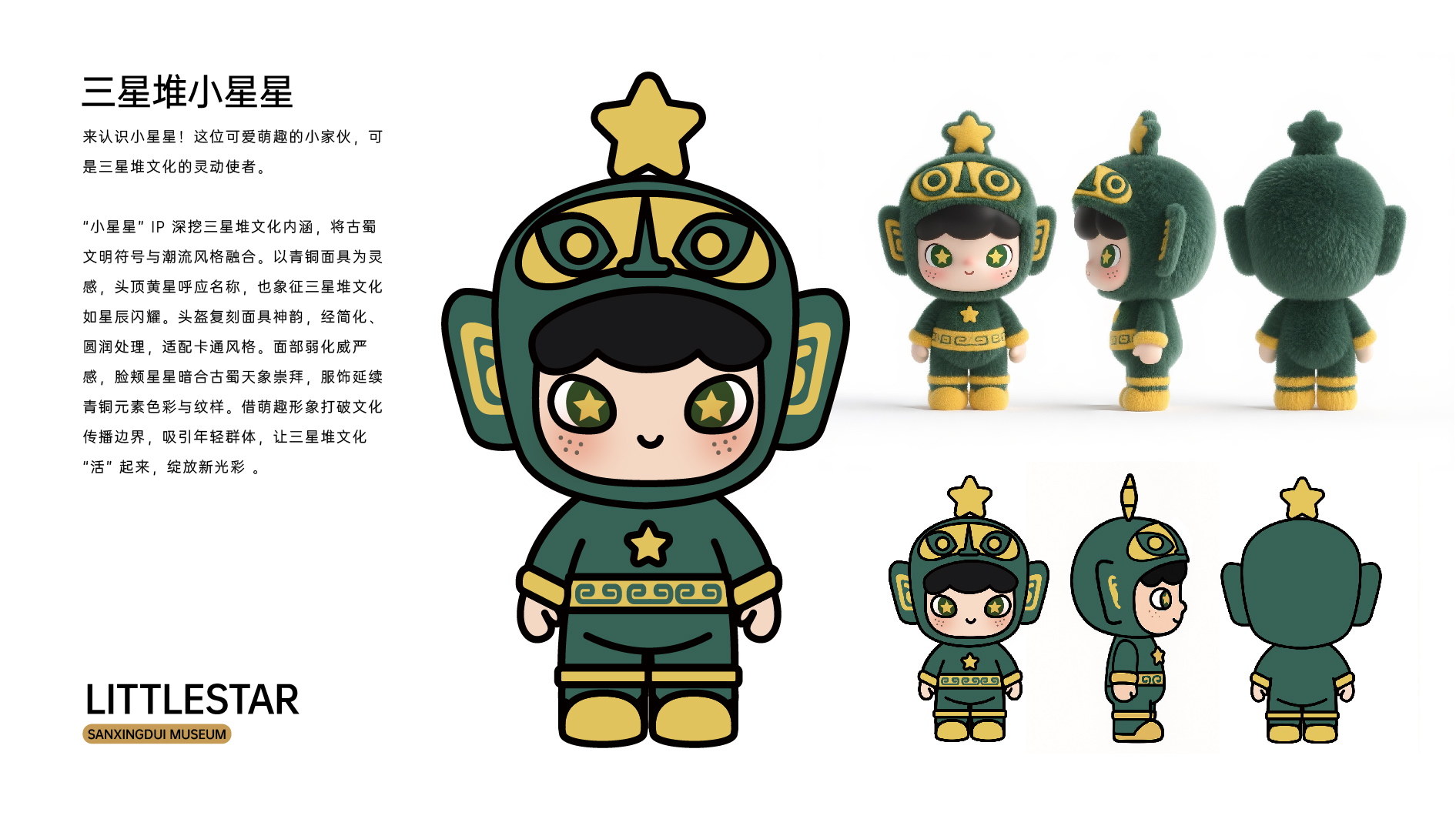 这位可爱萌趣的小家伙,可是三星堆文化的灵动使者。 "小星星"IP深挖三星堆文化内涵,将古蜀文明符号与潮流风格融合。以青铜面具为灵感,头顶黄星呼应名称,也象征三星堆文化如星辰闪耀。头盔复刻面具神韵,经简化、因润处理,适配卡通风格。面部弱化威严感,脸颊星星略合古蜀天象崇拜,服饰延续青铜元素色彩与纹样。借萌趣形象打破文化传播边界,吸引年轻群体,让三星堆文化"活"起来,绽放新光彩