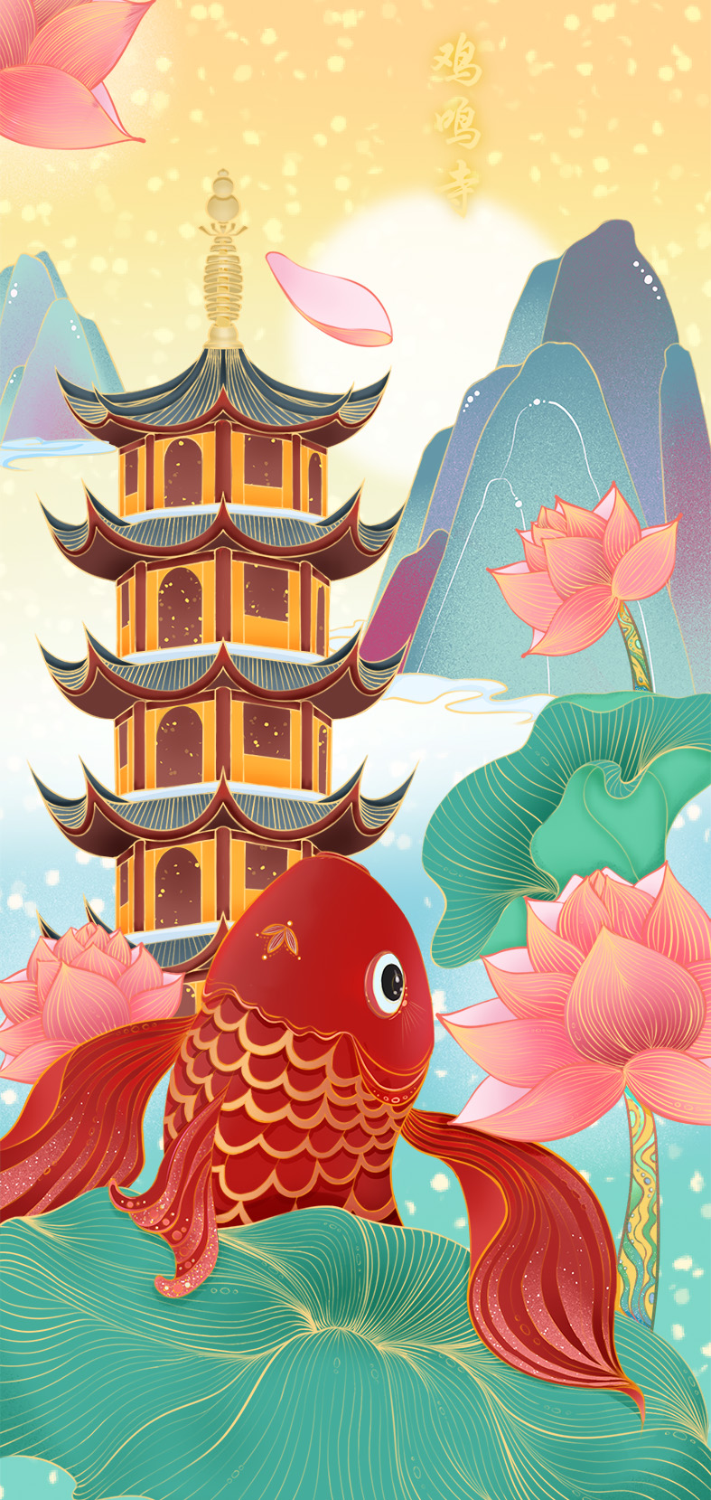 《古寺荷风锦鲤》新国风插画适配礼盒包装、文创周边、节日海报等多元场景,融合古寺、锦鲤、荷花等国风元素,采用金线描边与渐变色彩,视觉冲击力强,兼具东方美学与商业实用性,可直接用于品牌联名、伴手礼设计。