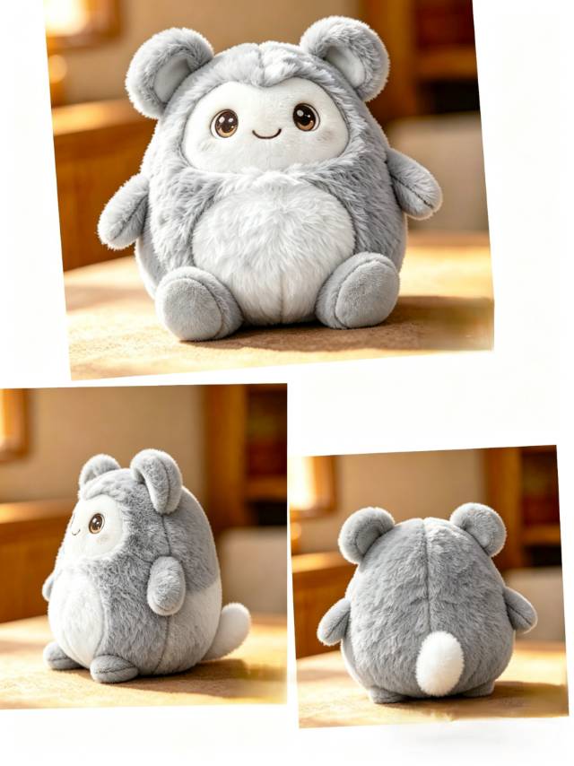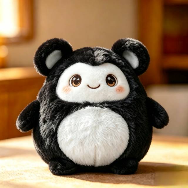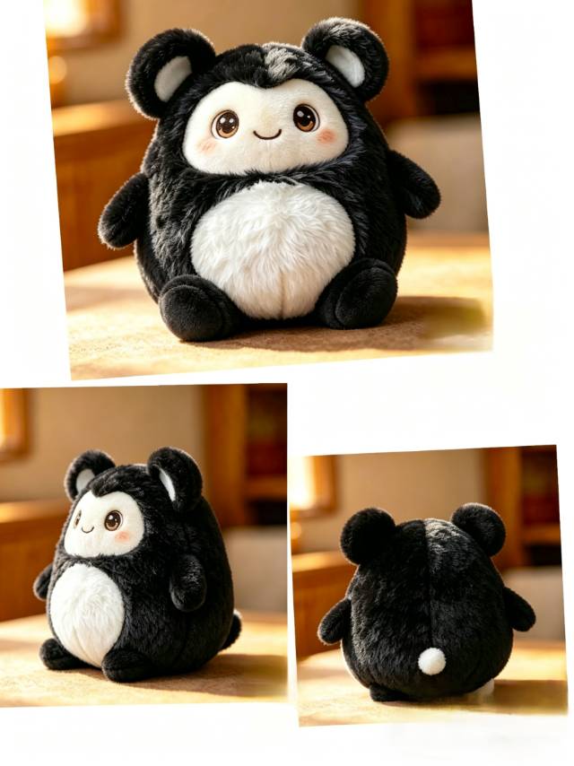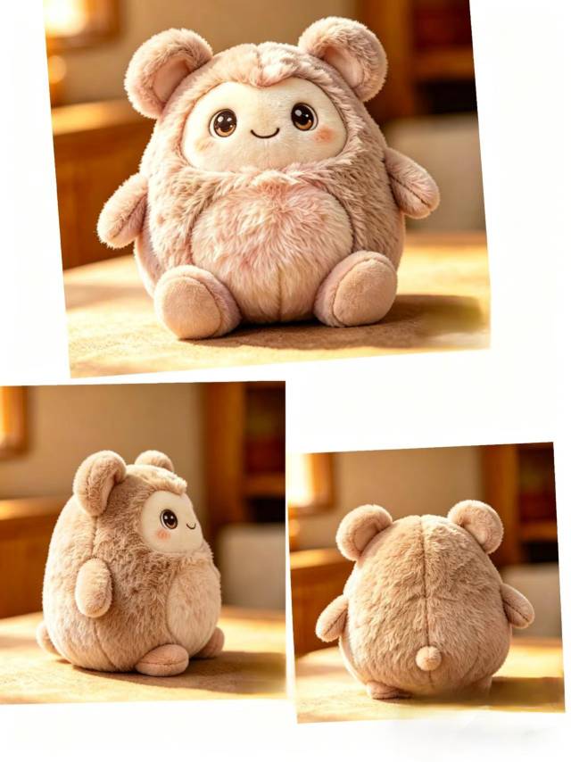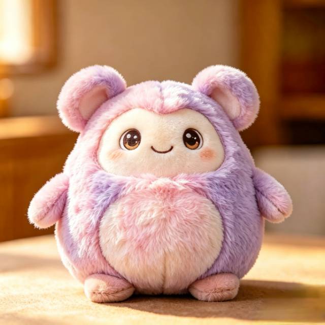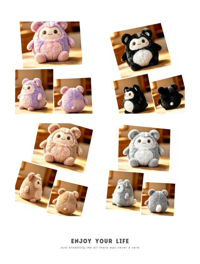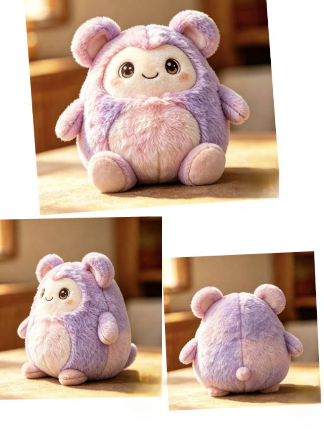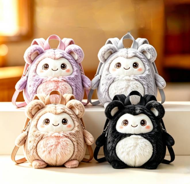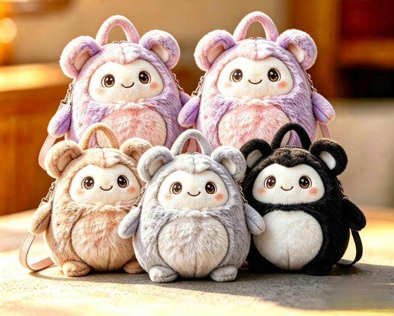 🔍 玩偶细节解析 1. 造型设计- 整体是圆滚滚的“小胖墩”造型,没有尖锐棱角,触感应该非常柔软,符合当下流行的“慢回弹”毛绒玩偶设计趋势。 - 头部有一对小巧的圆耳朵,耳内是浅粉色,和主体的粉紫渐变色彩相呼应。 - 脸部是奶白色的毛绒,搭配大大的圆眼睛、微笑的嘴巴和淡淡的腮红,自带“无辜感”,亲和力拉满。 - 腹部是浅粉色的圆形毛绒区域,和粉紫渐变的身体形成柔和对比,让整体造型更有层次。 2. 色彩与质感- 采用粉紫渐变的配色,从浅粉过渡到淡紫,自带梦幻感,很受年轻群体和儿童的喜爱。 - 表面是长绒材质,毛流感强,光线照射下能看出蓬松的质感,看起来温暖又治愈。 这是一组毛绒玩偶造型的单肩、双肩小背包。 1. 背包造型:保留了标志性的圆耳朵、微笑脸、腮红和软乎乎的大肚皮,整体的可爱感。 - 玩偶的身体直接做成了包体,拉链隐藏在玩偶轮廓的接缝处,既不破坏整体造型,又兼顾了实用性。 2. 多色可选- 目前有4种配色:粉紫渐变、浅棕奶茶色、浅灰色、黑白熊猫色,覆盖了少女心、温柔风、中性风等不同