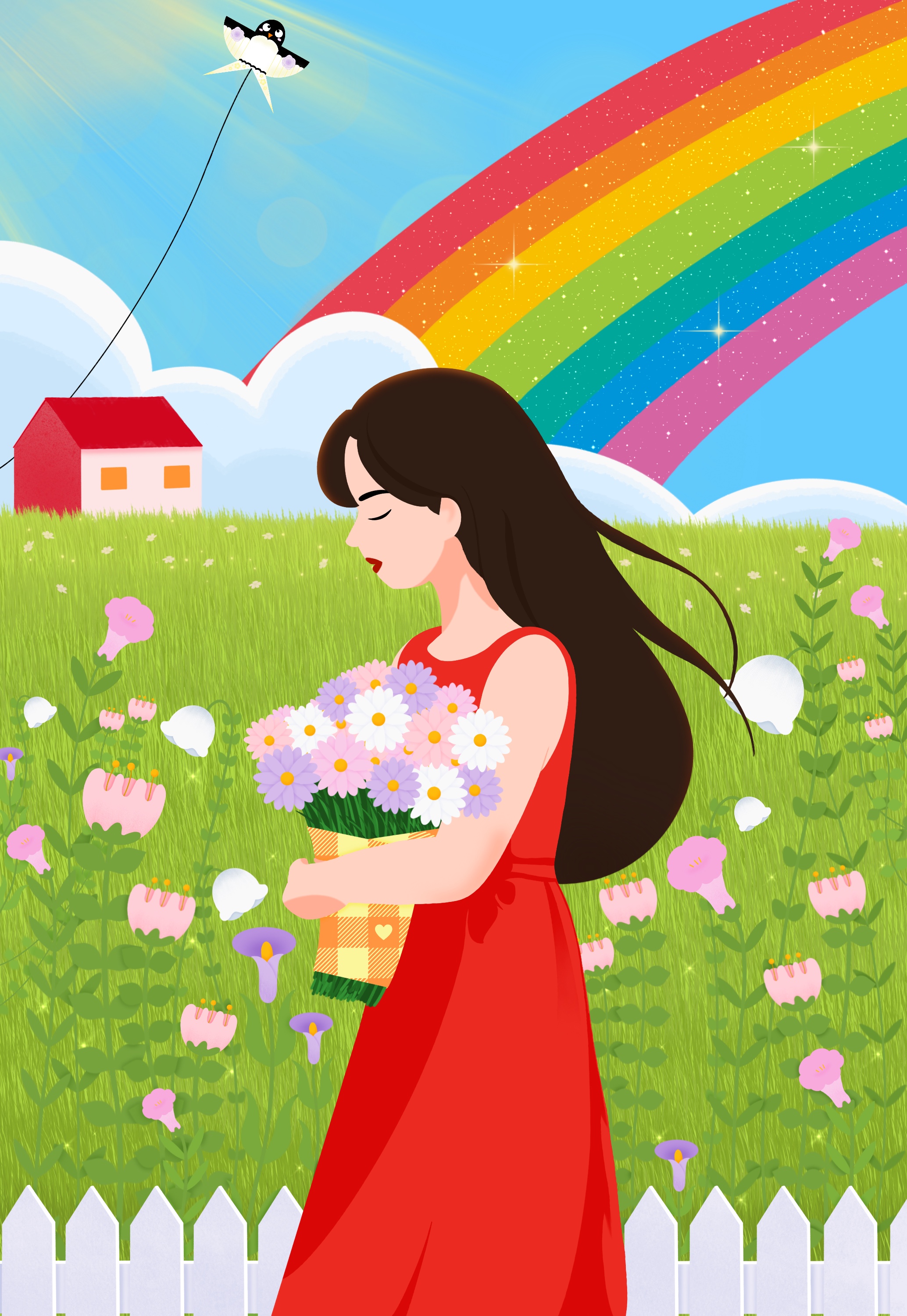 《参加文创展征集》 那是一个晴朗的午后,阳光温柔地洒在大地上,微风轻拂,轻轻撩动着女人的长发。她的发丝在风中微微扬起,像是被风儿轻轻抚弄的丝绸,柔软而飘逸。她身穿一袭红色的连衣裙,鲜艳的色彩在阳光下显得格外耀眼,仿佛一朵盛开的玫瑰,散发着迷人的魅力。她的怀里抱着一大捧鲜花,它们在她的怀中簇拥着,仿佛在向她诉说着大自然的美丽与温柔。 女人的身后是一片美丽的花园,花园被白色的栅栏围了起来。花园里的花朵们似乎都在朝着女人开放,仿佛她是这片花园的女王,所有的花儿都在向她致敬。远处的草地上,一栋红色的小房子静静地矗立着,在阳光的照耀下显得格外温暖。房子后面,一只风筝被风吹得高高的。 天空中,大片的云朵像棉花糖一样柔软。在云朵的后面,一条巨大的彩虹横跨天际,彩虹的颜色鲜艳而明亮,仿佛是大自然用画笔在天空中描绘出的一幅美丽的画卷。在阳光的照耀下,彩虹微微发着点点亮光,仿佛在向人们展示着它的神秘与美丽。