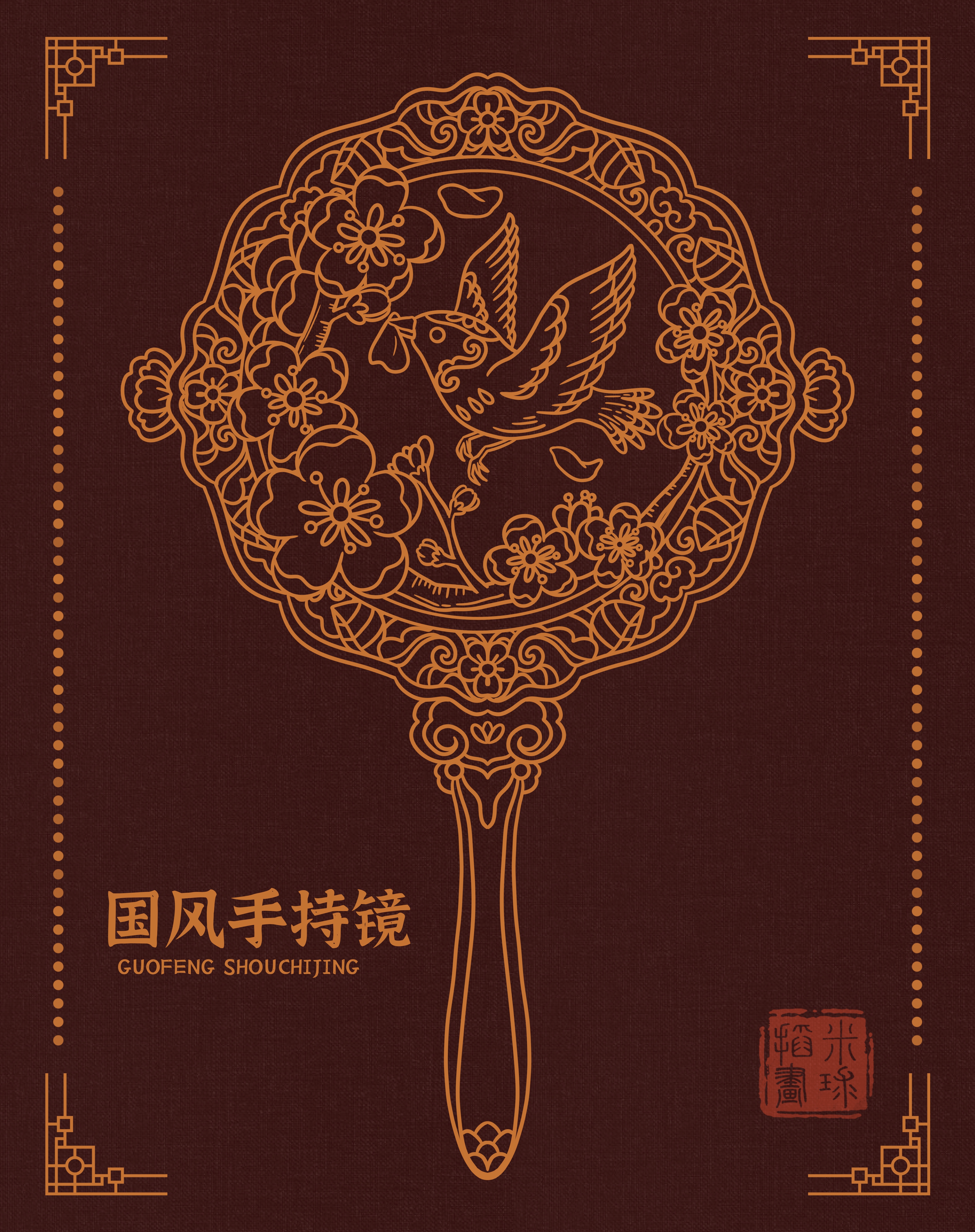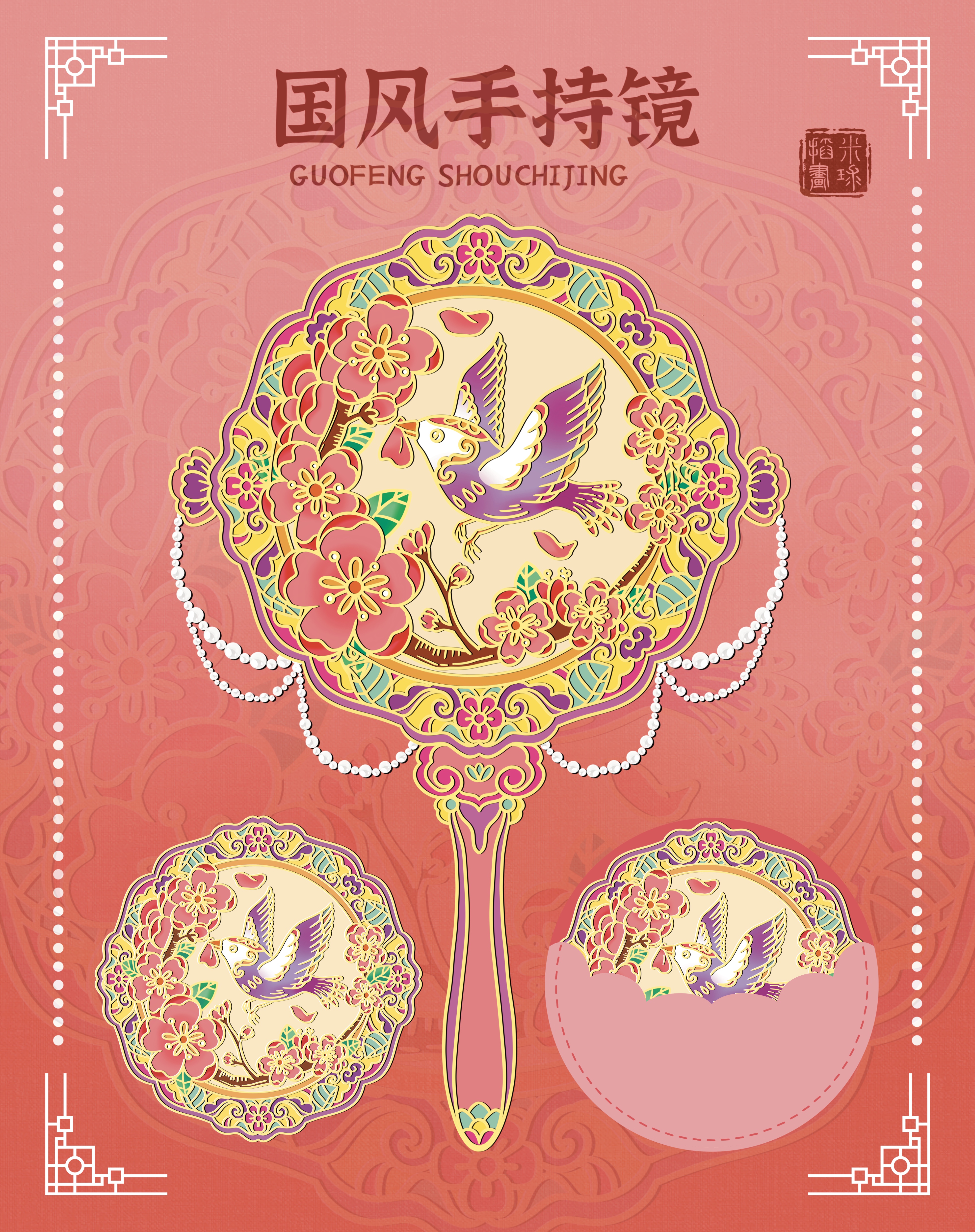 花鸟国风手持镜文创设计,灵感源自中国传统花鸟画所蕴含的优雅意境与深厚文化底蕴。旨在将古典的花鸟元素与现代的手持镜功能相结合,打造出一款既具实用价值又极具艺术美感、彰显国风韵味的文创产品。整体色调选取了粉色与紫色系,营造出浪漫、温婉且富有诗意的视觉氛围,契合国风所追求的含蓄之美。粉色和紫色调的运用是这款手持镜设计的一大亮点。粉色向来象征着温柔、甜美与浪漫,在中国传统文化中,常与女性的柔美、优雅联系在一起;紫色则蕴含着高贵、神秘的意味,自古便有 “紫气东来” 等吉祥寓意,代表着祥瑞与尊崇。二者搭配在一起,既营造出了如诗如画的浪漫氛围,又凸显出了产品的高雅格调,让人一眼望去便仿佛置身于古代的宫廷园林或是文人雅士的庭院之中,感受到那份独有的国风韵味。