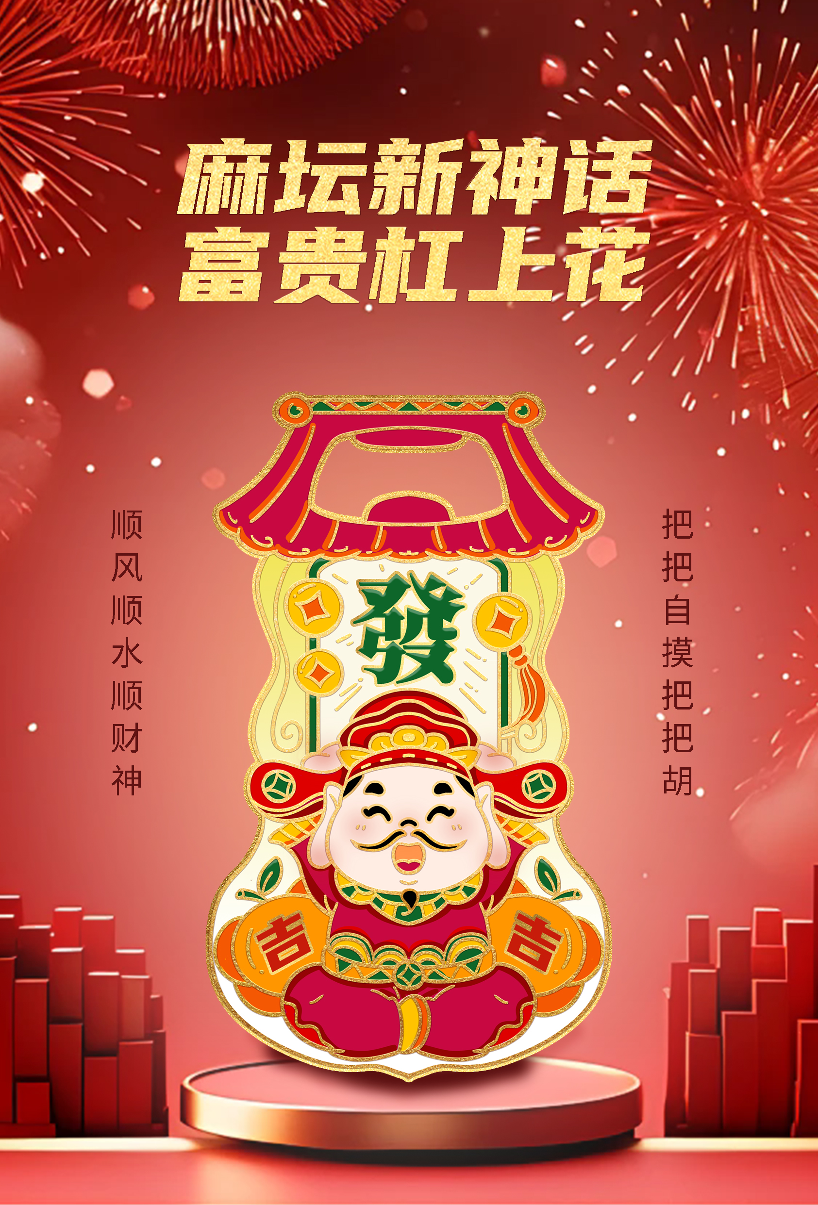 财神爷启瓶器整体以传统财神爷形象为蓝本进行设计。财神爷采用坐姿,双手举着发财麻将,展现出一种亲切且富有活力的姿态。其面部圆润,笑容满面,眼睛炯炯有神,手持如意的手臂自然弯曲,增添了几分灵动之感。整个财神爷形象的身体比例经过精心设计,既保证了其形象的辨识度,又使其在作为启瓶器使用时能够保持稳定的重心。