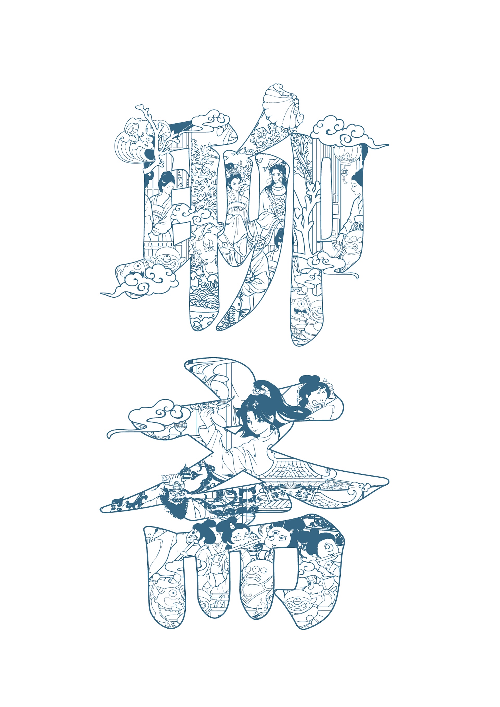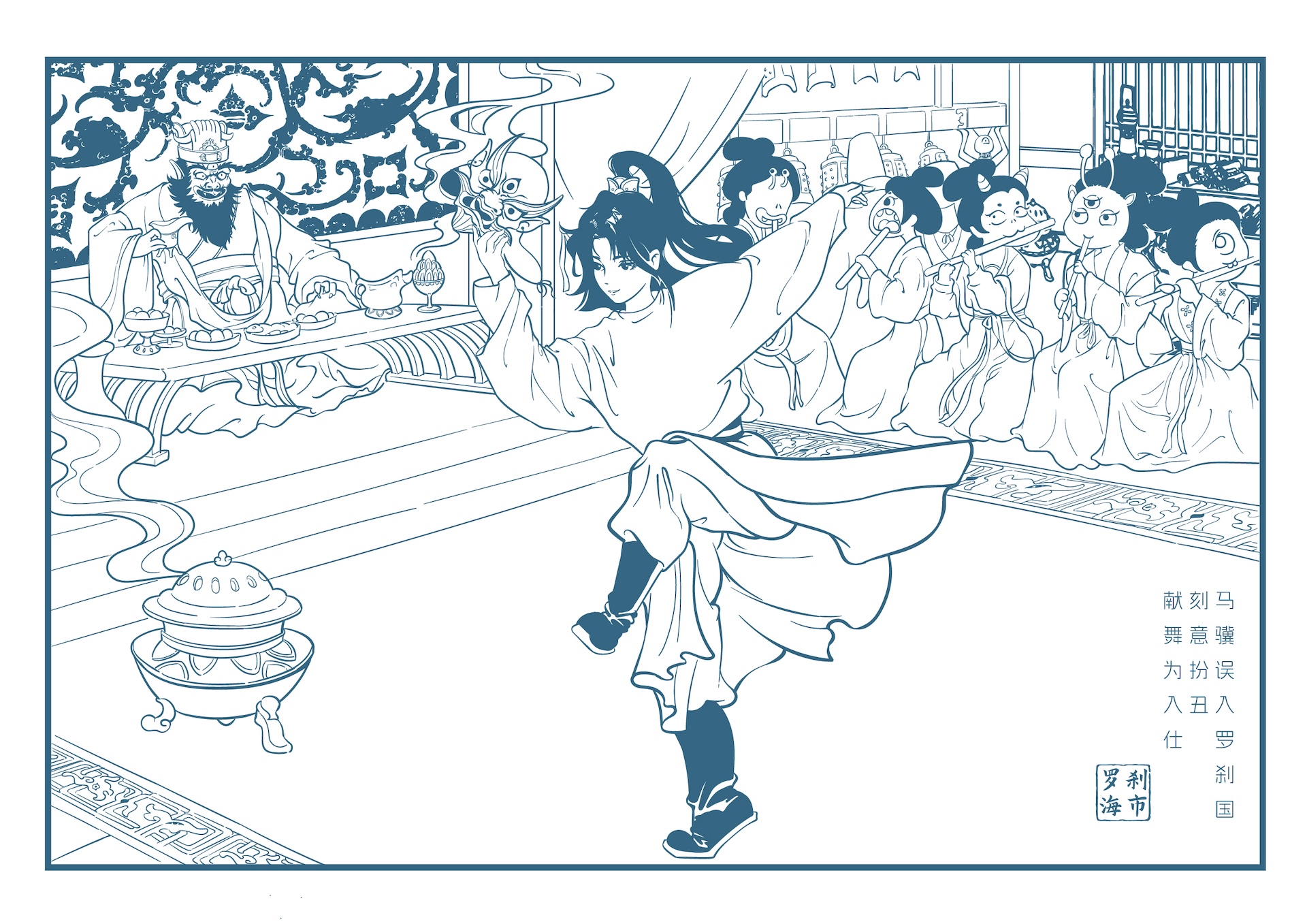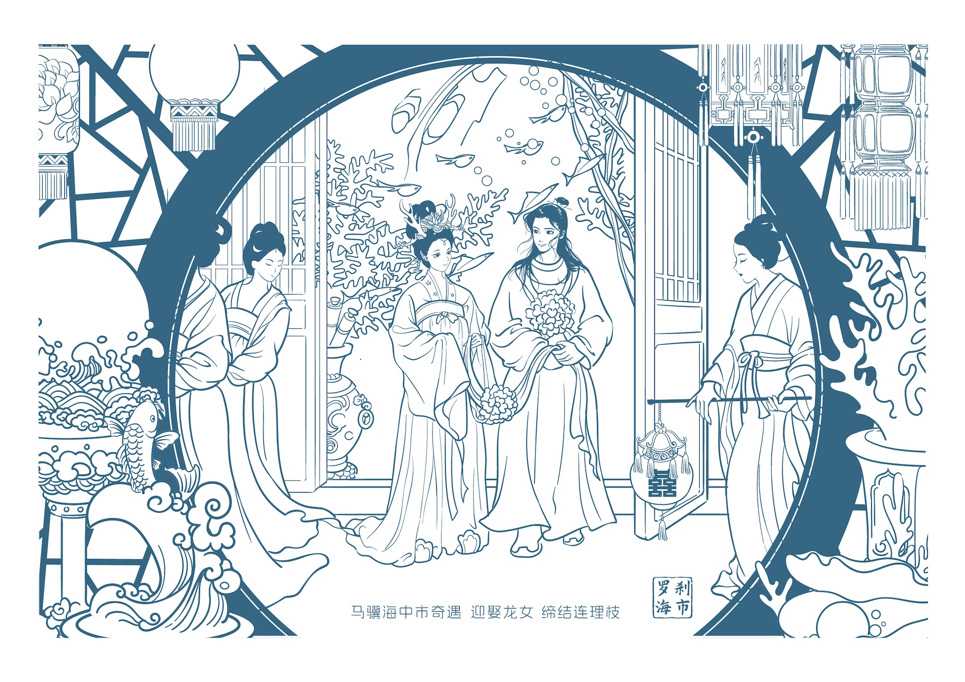 2023年夏天,刀郎的新歌《罗刹海市》再次掀起了淄博的聊斋热潮。这套作品的创作灵感来源于《聊斋志异·罗刹海市》。其中包含三幅插画:聊斋字绘、马骥献舞和缔结连理。 《马骥献舞》描绘了一个充满奇幻与想象的场景。在画面中心,主人公马骥手持一张丑陋的面具,在罗刹国的宫殿中为大王献舞。他的舞姿优雅而有力,仿佛在与这个奇幻的世界进行沟通。在周围,各种罗刹国特有的小怪物们吹奏或打击乐器,为马骥的舞蹈伴奏。它们的形态各异,充满神秘和趣味。 《缔结连理》讲述了马骥在龙宫与小龙女喜结连理的美好瞬间。在画面中央,马骥与小龙女手持团花布条,目光含笑深情地相望。周围的仕女手持喜灯,面带微笑,营造出浪漫而神圣的婚礼氛围。前景中的龙宫摆件和悬挂的喜灯增添了神秘和喜庆的氛围。整幅作品展现了龙宫婚礼的唯美与浪漫。 最后,作者用之前提到的两幅插画的元素描绘了“聊斋”字样。这些插画可用于制作金属冰箱贴、活版印刷明信片和集章本,旨在给参观过聊斋园的游客带来一些独特的聊斋回忆。