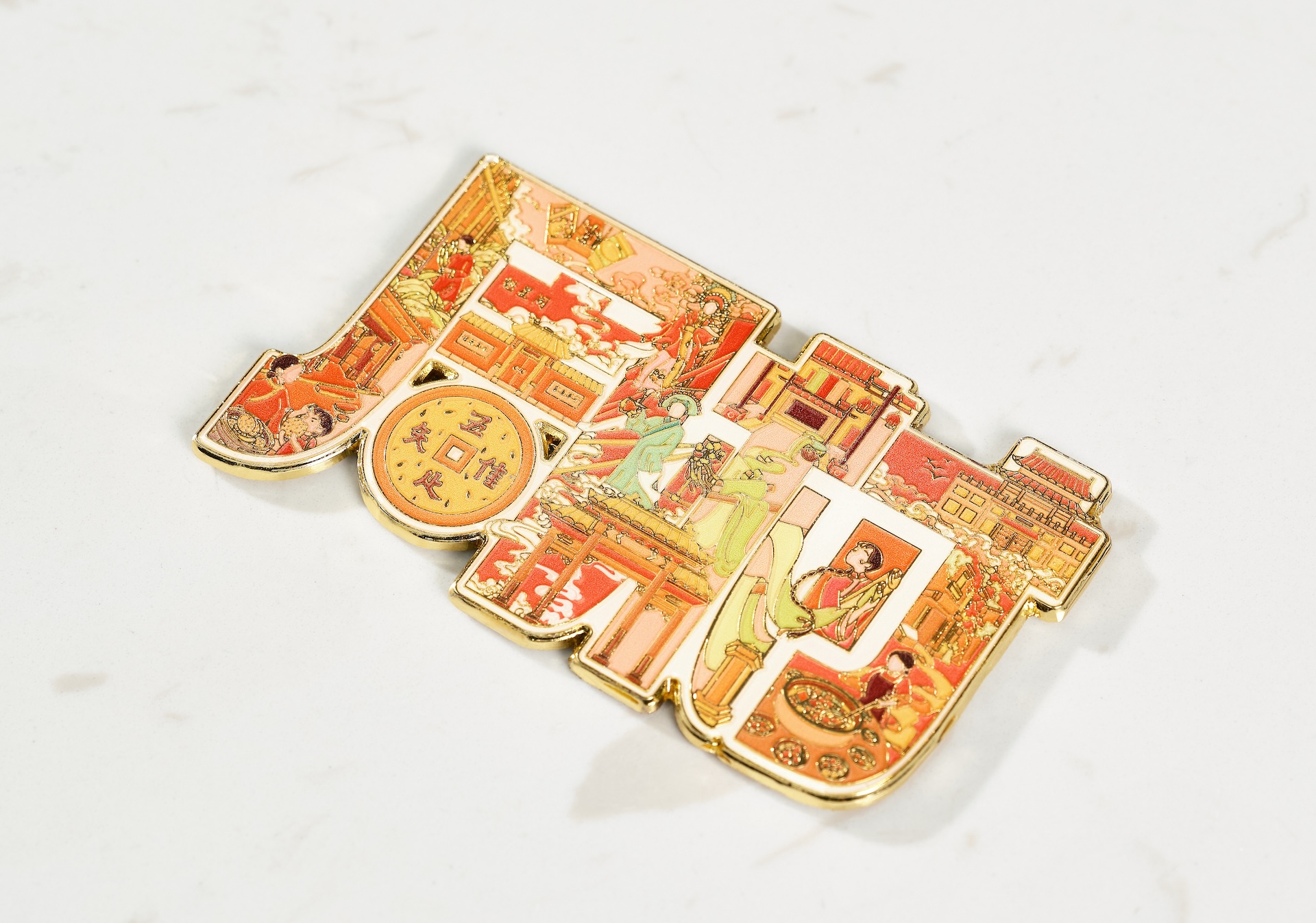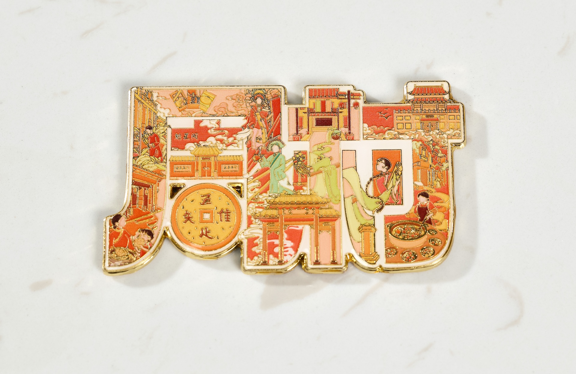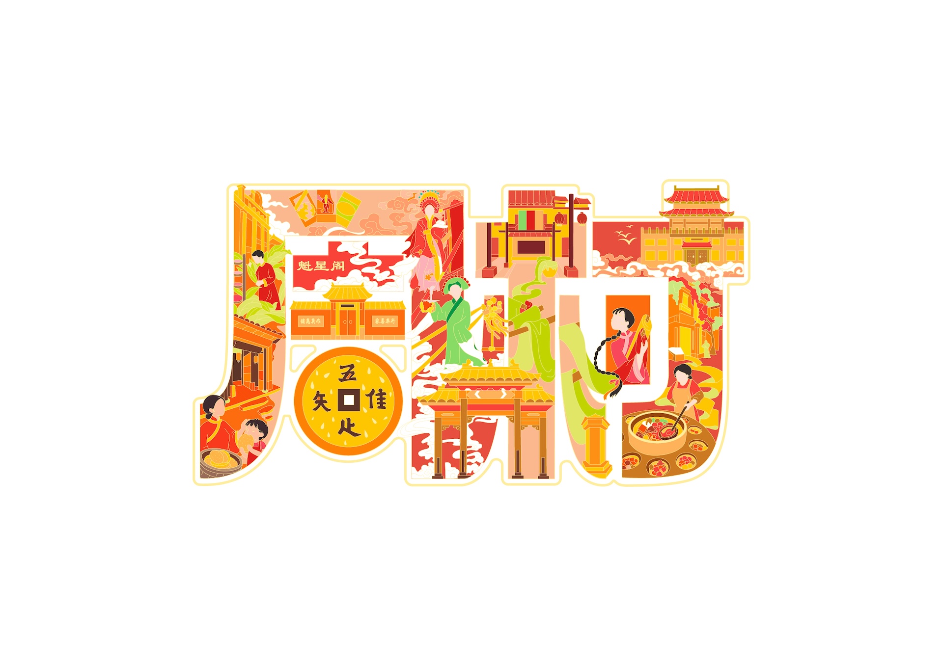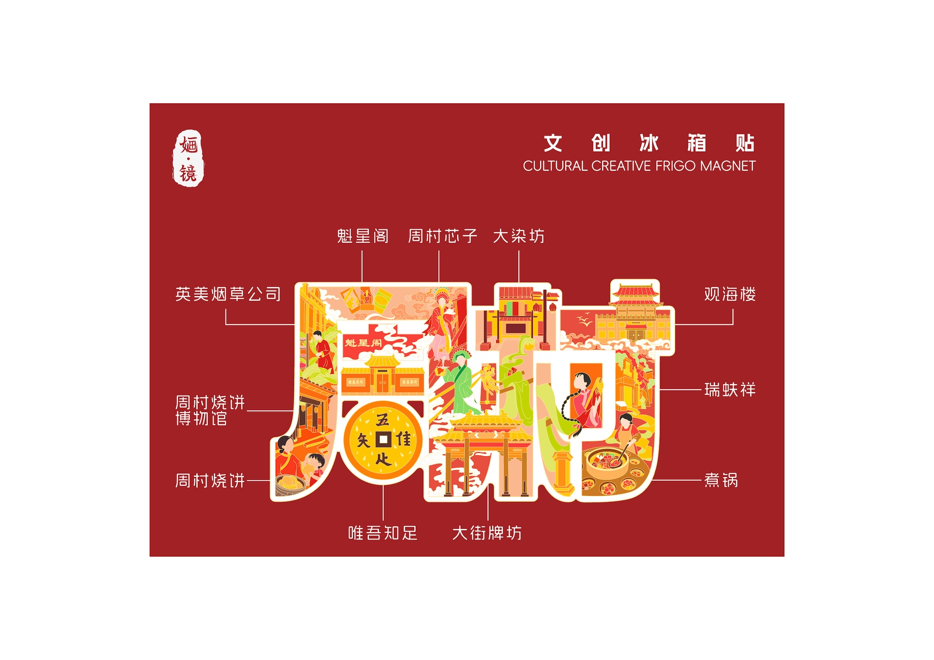周村古商城又称“旱码头”“周村大街”,其历史悠久、保留完好,被誉为“中国活着的古商业建筑博物馆群”。设计团队对“周村”二字进行字体设计,并用众多博物馆建筑及其人文元素进行填充:英美烟草公司展览馆、周村烧饼博物馆、魁星阁、大染坊、瑞蚨祥等建筑、薄脆可口的周村烧饼、周村独特的表演形式周村芯子和当地特色美食周村煮锅。大德通票号庭院内的“唯唔知足”铜钱纹样同样吸引了大家的眼球,仿佛看到了中国古代周村人民商业往来、知足常乐的美好生活。作者将天圆地方形状的铜钱和周村烧饼结合,意在表达周村经济、美食等各类文化在历史的演变下的和谐与包容,成为整件作品的点睛之笔。