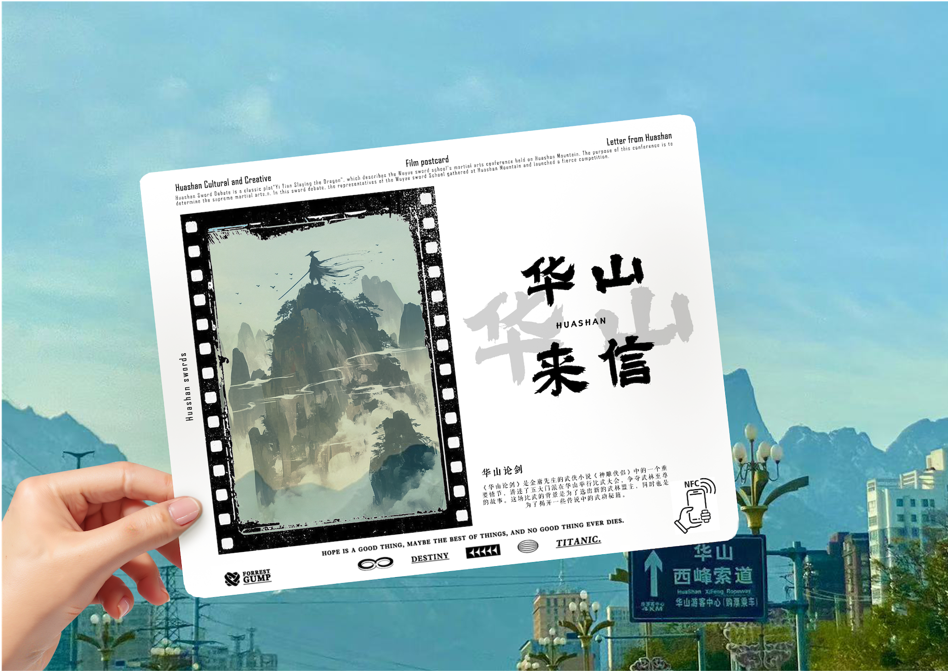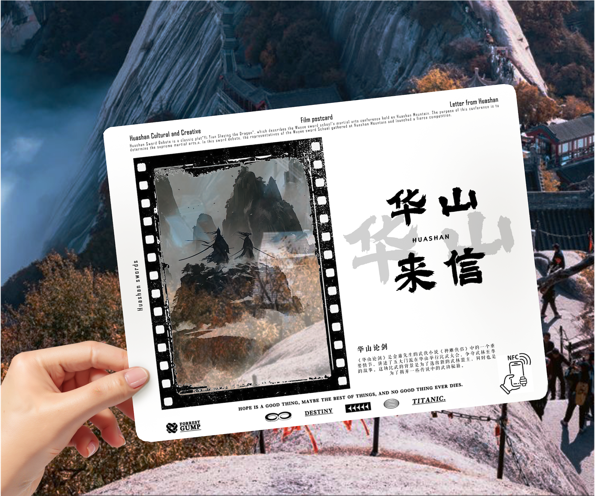 产品设计灵感来源于华山论剑和华山非遗老腔。风格上回归中式水墨武侠情境,运用水墨晕染技法,传神的描绘出华山那雄浑壮阔又不失神秘幽邃的景致,手机靠近NFC区域,视频展示,仿佛能听见山风在峰林间呼啸。武侠元素自然融入其中,从细节之处彰显江湖的快意恩仇与豪爽气魄。